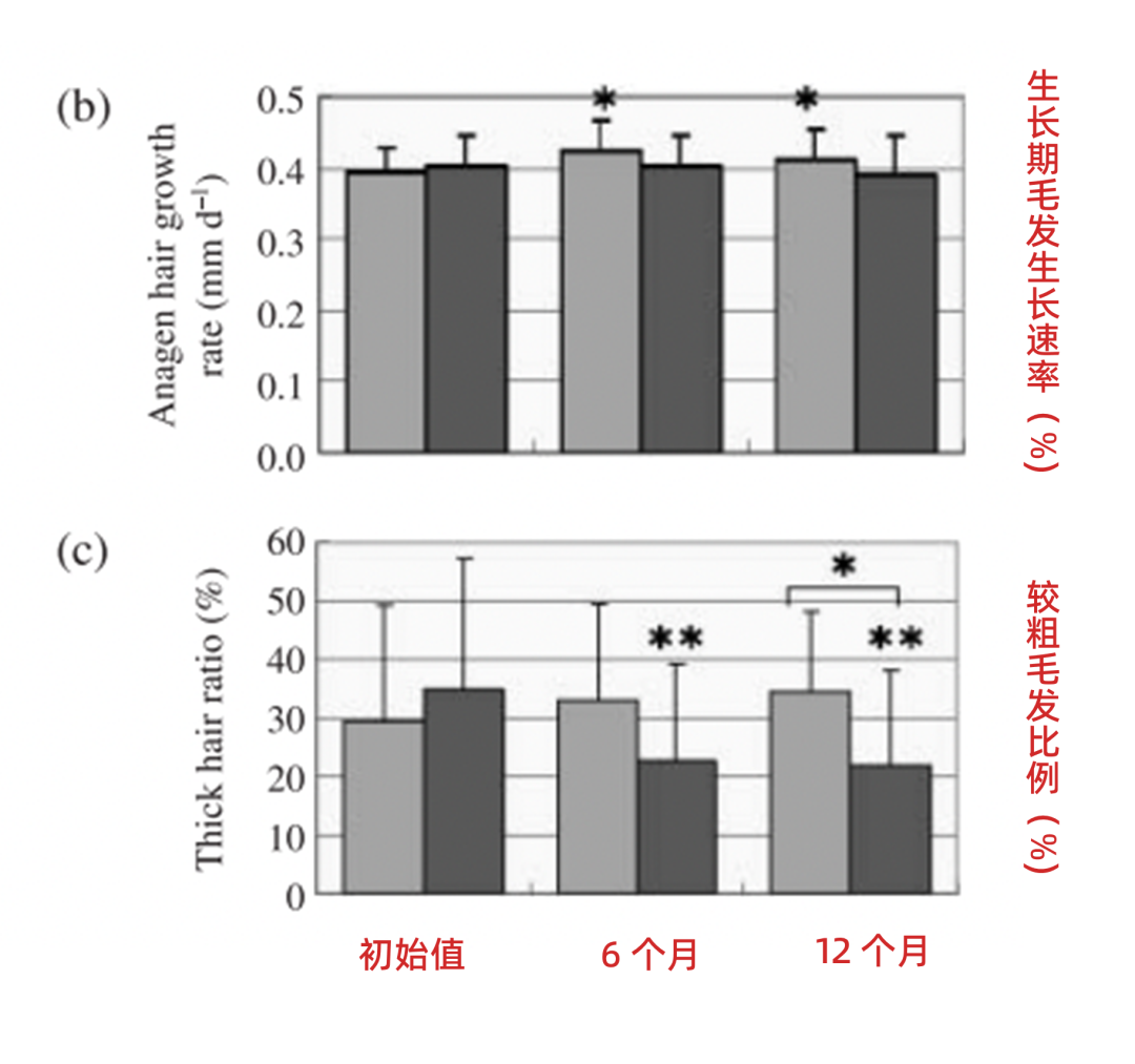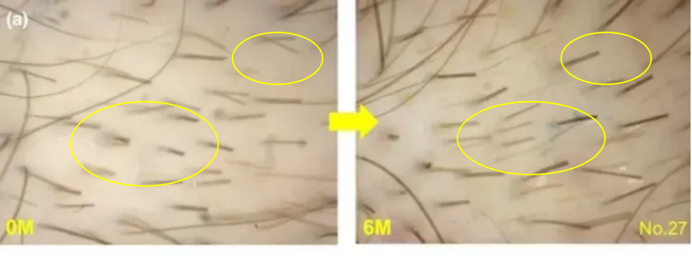 6 个月临床研究中, 腺苷组终毛比例和毛发密度显著高于安慰剂组,小绒毛不断变长变粗。