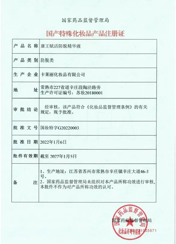 康王防脱赋活精华不仅有 0.75% 黄金浓度腺苷,还进行了严格功效试验,稳稳拿到「国妆特字防脱特证」 。