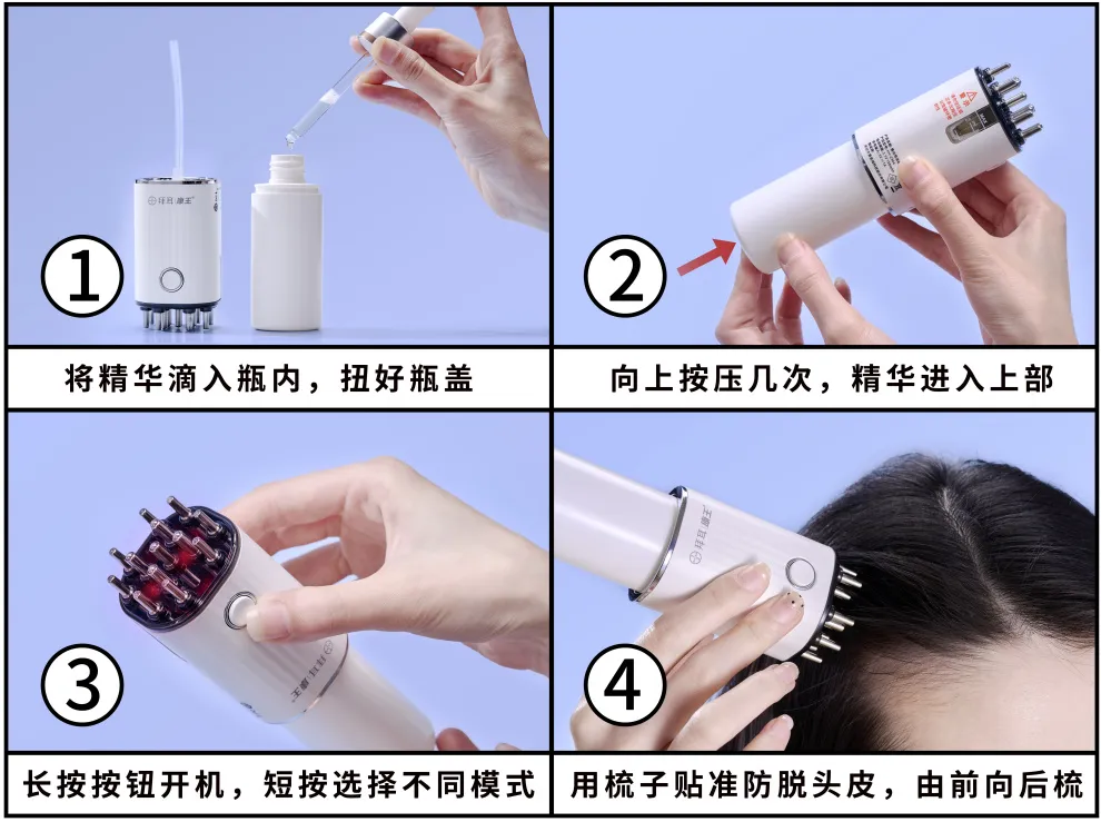 3 瓶装还会搭配红光导液梳,直接将精华倒入仪器,贴准头皮往后梳,出液又快又顺滑,发缝、发际线区域可以重点多梳。