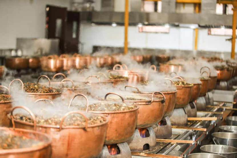 膏方制作室里,经验丰富的中药师朱晓春正在用竹搅片翻着紫铜锅里的药材。他介绍,“岳阳膏方”坚持用紫铜锅煎煮,分七个步骤:配方、浸药、提取、浓缩、收膏、分装、晾膏。这七个步骤需要一天半到两天时间。